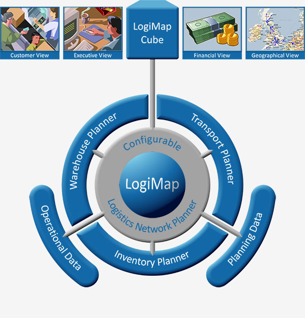 LogiMap CubeThe Control Tower viewFlexible reporting and query management facilities are provided to generate customer, financial, geographical and executive views of the logistics network. |